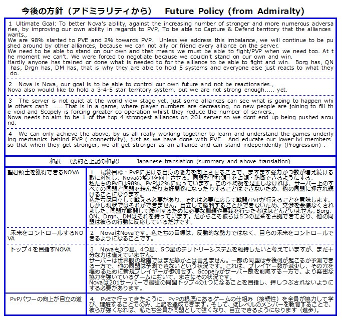 私は、それぞれのゲームスタイルやライフスタイルを尊重して、同盟員と他のプレイヤーとの健全で友好的な関係を築きなら、宇宙の旅を楽しんでいきたいと考えます。
