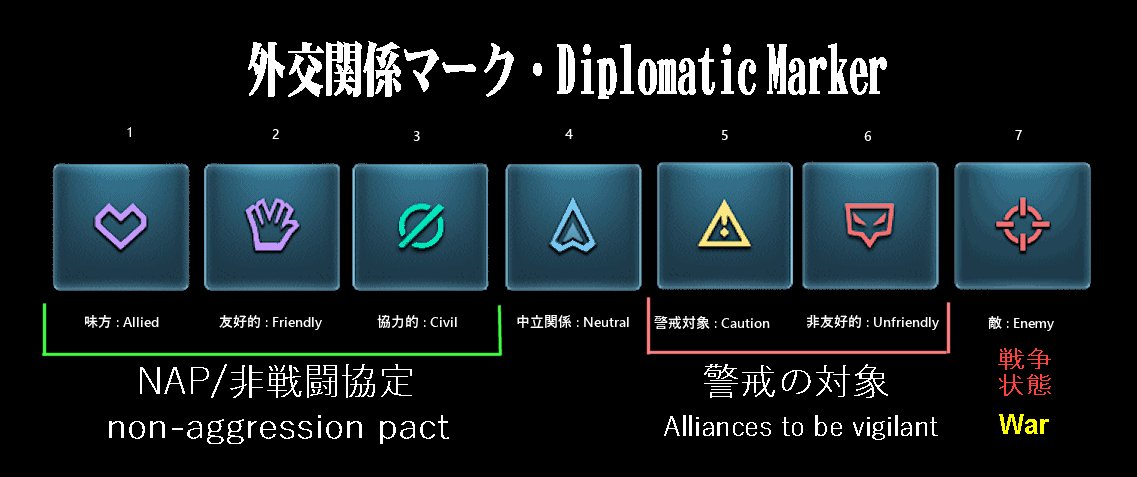 ● プレー上で重要なことは、NAPという相互に戦闘を行わない同盟に3種類あることです。これらの同盟対しては、ROEで許されている攻撃を一切行わないということです。これは、相互の了承がない限り、PvPイベント・ミッションでも同様の対応です。従って、これを攻撃することは、ROE違反と同じように外交関係上の問題となります。