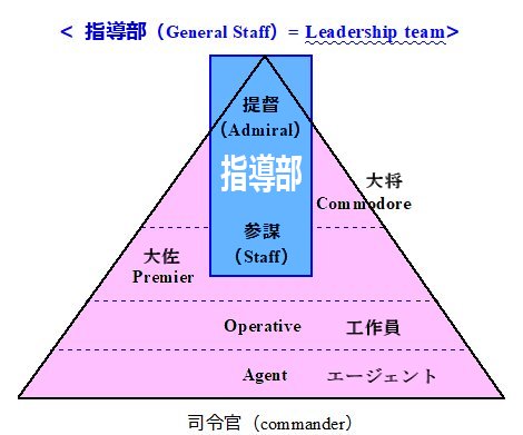 これはGENE同盟の組織図ですが、階級は5つあります。諜報員、工作員、大佐、大将、提督の5つです。青枠の中には、同盟の運営を担当するスタッフで、階級ではありません。この呼称と職務については、マネージメントのページをご覧ください。