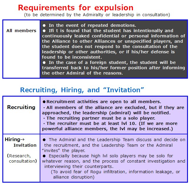 ● 運営に記載されているとおり、ゲーム内ではすべての大佐・大将(提督)に昇格・降格の権限が与えられています。しかし、GENEでは、昇格・降格によって、メンバー間の不満や疑念が、昇格・降格させた側や、昇格・降格させられた側に向かうことを避けるために、提督や指導部がこのように決定しました。また、これらのことは、採用(招聘)・追放においても同じ扱いとします。