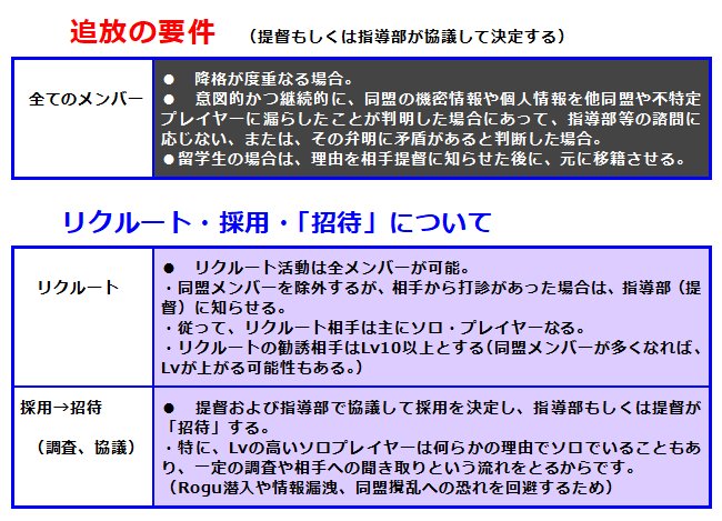 ● さて、このページでは「昇格・降格」「追放」「募集・採用」の3つに分けて、その大まかな条件を公開します。そして最後に補足として「指導部への採用」について記します。