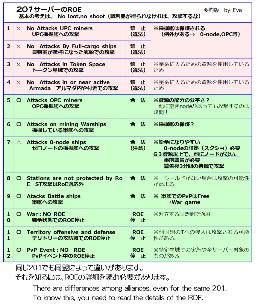 標準的なROEは、領土占領のイベント時を除き、その領土を支配している同盟に適用される。いかなる理由であれ、他の同盟の領土に入った者は、ROEの保護を受けられない。